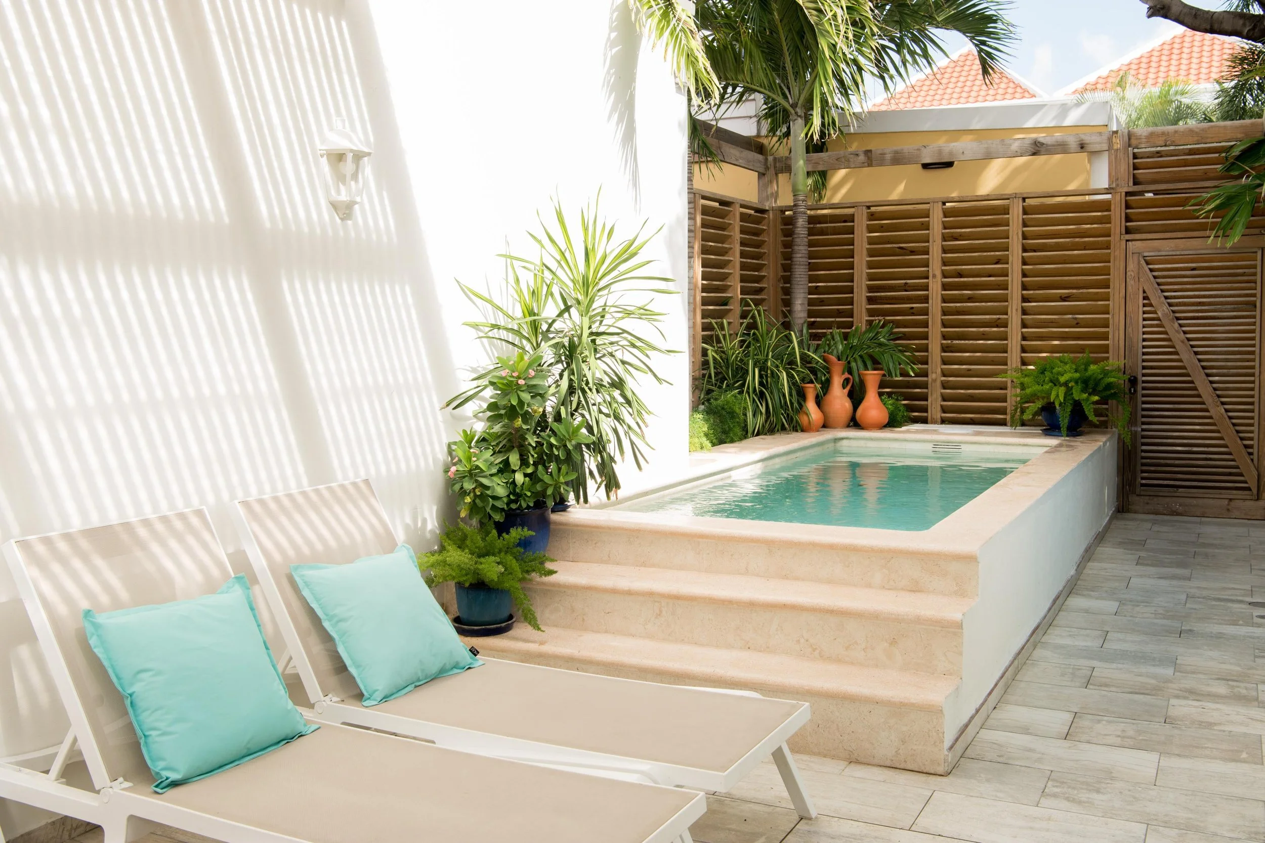 Los huéspedes también tienen acceso a una piscina compartida (3x6X1,2 mtr) y un jardín tropical con tumbonas, ideal para unas merecidas vacaciones de relajación y el lugar perfecto para pasar una tarde perezosa. Un gran lugar, lejos de los sonidos urbanos para sentarse y descansar bajo el viejo árbol Kenepa, tomar una copa, relajarse y charlar con los otros huéspedes.
